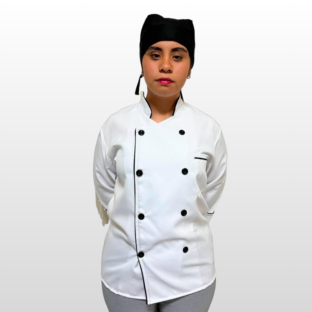 Esta combinación es perfecta para chefs que buscan un look relajado pero profesional. La filipina, de corte recto y transpirable, se complementa con el gorro estilo bucanero, que brinda frescura, libertad de movimiento y un toque audaz.