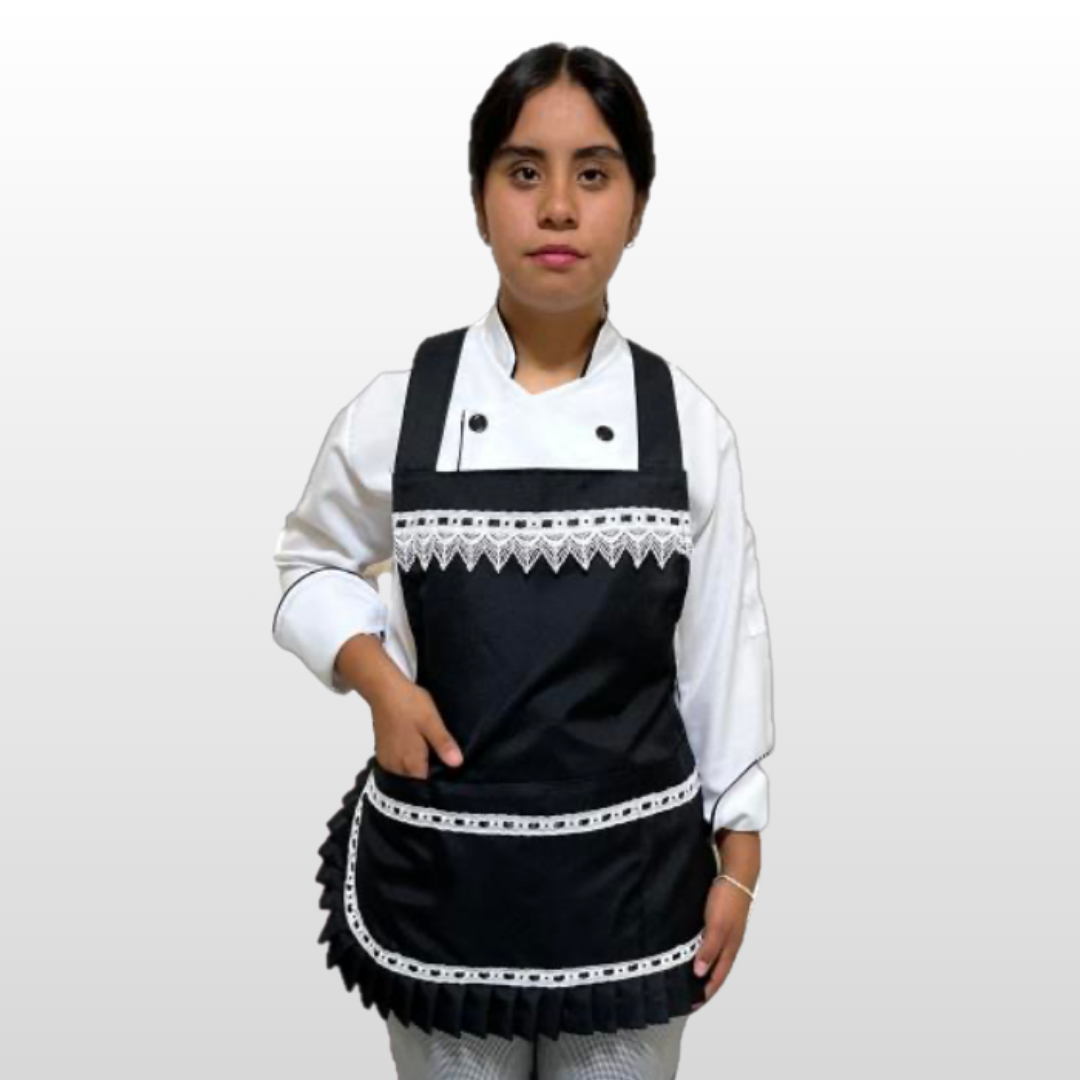 Con detalles decorativos, el mandil de olán es perfecto para reposteras, meseras o cocineras que buscan lucir únicas sin perder funcionalidad.